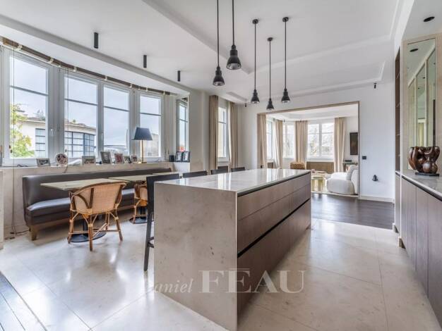 Dans un immeuble de standing inscrit au parcours des années 30, appartement traversant de 133.13 m² Carrez entièrement rénové en 2022 avec vue dégagée. Il comprend une entrée, un double séjour en ang...