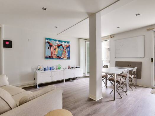Au sein d'une résidence récente (1985), donnant sur une vaste cour au calme, très beau duplex aux volumes rares et à la rénovation raffinée. L'entrée dessert un bel espace de vie comprenant une cuisi...