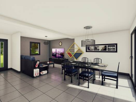 Sur ce terrain, nous vous proposons cette maison neuve, le modèle Ménilière, une maison plain-pied moderne qui intègre de base un garage et une longue galerie sur la face avant. Avec une surface de 1...
