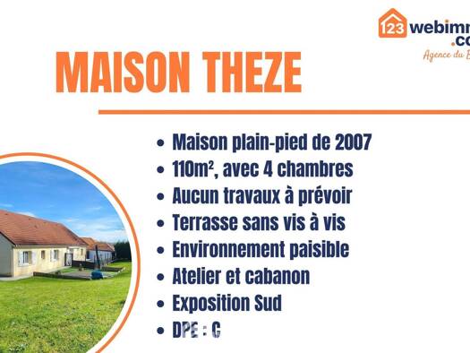 Votre agence 123webimmo vous présente : Charmante Maison de Plain-Pied de 2007 située sur la commune de Thèze - Terrasse sans vis à vis - Environnement Paisible. Vous recherchez une maison où le conf...