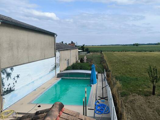 250 mètre carré d'hangar avec dépendance d'environ 60 mètres carrés (actuellement en chenil) ainsi qu'une maison climatisé T6 de 150 mètres carrés avec piscine agrémenté d' un abris escamotable.(Menu...