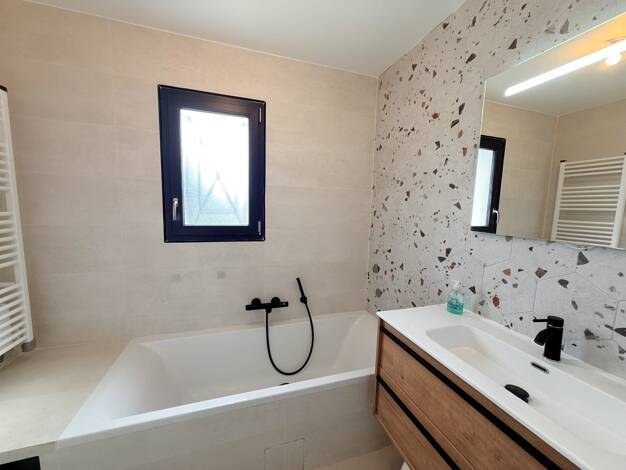 Maison individuelle dans quartier calme de Baillargues Construction traditionnelle (parpaings, isolation et briques) Étage entièrement rénové comprenant deux chambres, une salle de bain avec baignoir...