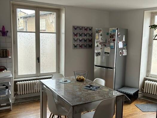 La maison mitoyenne d'un côté de 137 m2, louée, comprend au rez-de-chaussée l'entrée par une véranda menant à une pièce de vie incluant un poêle à granulés, une cuisine toute équipée, une chambre, un...