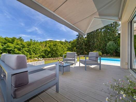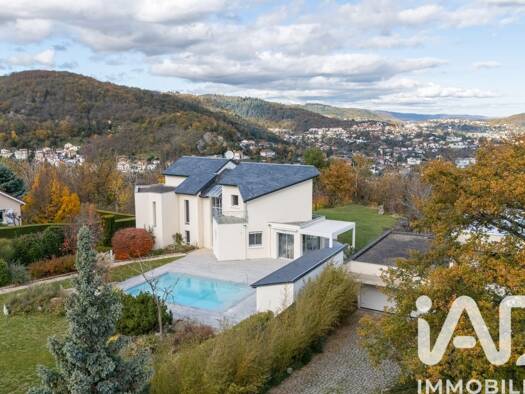 iad France - Mathieu Pallix vous propose: Villa d'Architecte avec vue panoramique, piscine, parc paysager et forêt à Royat Située dans un cadre privilégié et paisible, cette maison d'architecte d'exc...