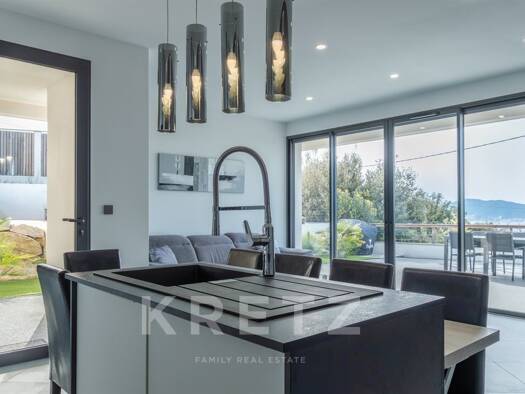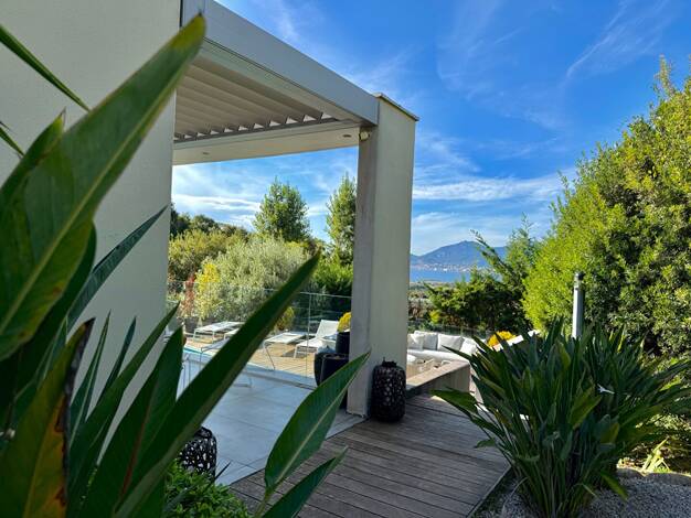 RV1873- Rive-Sud-d'Ajaccio Villa contemporaine, récente, avec vue panoramique sur la mer et le golfe d'Ajaccio, non loin des plages de sables fins. Cette villa d'environ 250 m² est composée d’une vas...