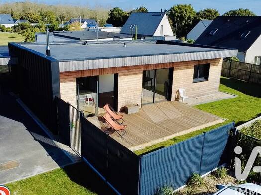 iad France - Nathalie Le Bricquer vous propose: A 3 km de la mer - Au centre de GUIMAEC - MAISON D'ARCHITECTE de 2005 de plain pied avec de beau volume et très lumineuse avec une belle terrasse plein...
