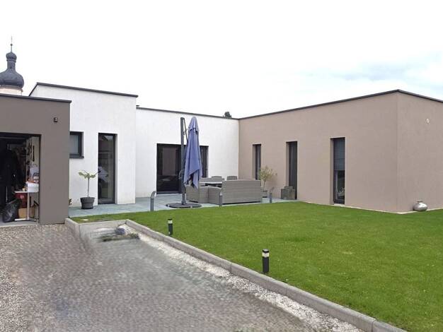 Exclusivité. A Grussenheim, 10 minutes de Marckolsheim, très belle maison contemporaine et récente, de 2021, sur 126 m² de plain-pied sur un beau et grand terrain de 10,50 ares. Elle est très lumineu...