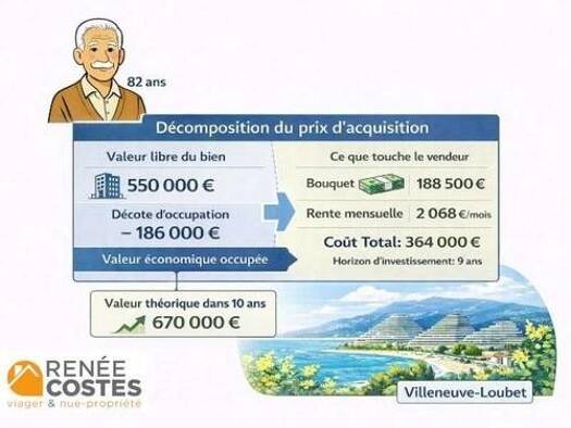 Villeneuve-Loubet Vente en VIAGER occupé 500m plages Référence 422506397 Age : Femme de 74 ans / Homme de 80 ans Bouquet : 109200 EUR Rente : 428 EUR/mois Prix d'achat : 165710 EUR Nous vous rappelon...