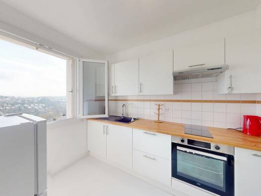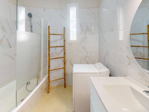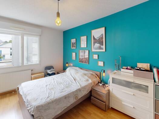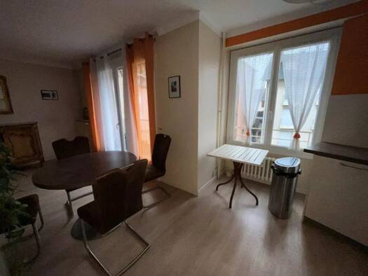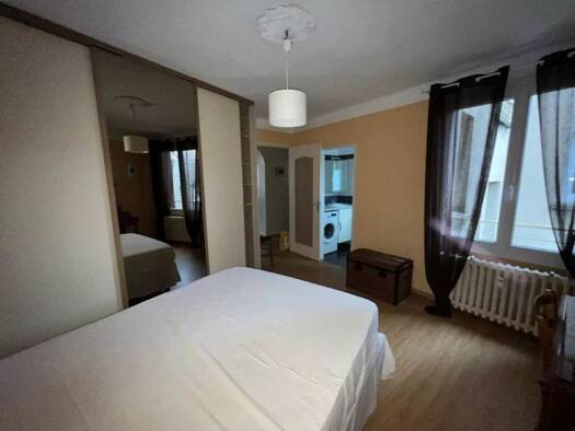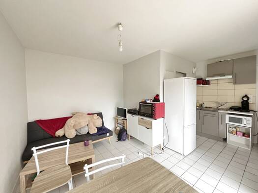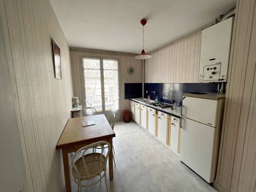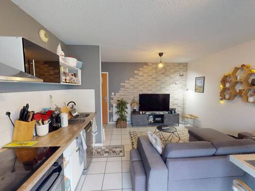 Une entrée avec meuble vide poche, une cuisine américaine avec éléments haut et bas, une hotte, un four, un frigo, plaque induction, lave-vaisselle, micro-onde, un séjour donnant sur balcon avec placard encastré, un buffet trois portes, une table basse, un canapé, une table ronde à manger, 4 chaises, une chambre avec placard, un lit en 140 cm, une coiffeuse, une mâle, une salle d'eau avec meuble vasque, lave-linge en 60, cabine douche, meuble miroir, un WC avec placard rangement. Cave n°7 au -1...